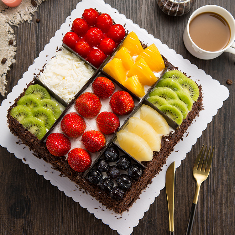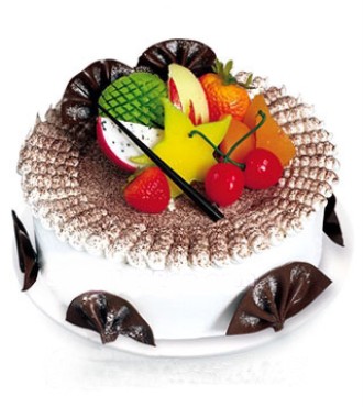 • 8寸鮮奶水果蛋糕,中心放各色時令水果,扇形巧克力插片