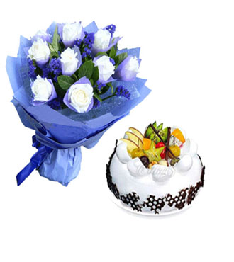 • 白玫瑰9枝單枝包裝,(勿忘我點綴),8寸水果鮮奶蛋糕