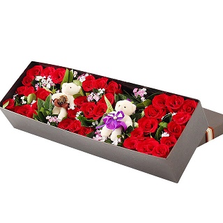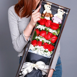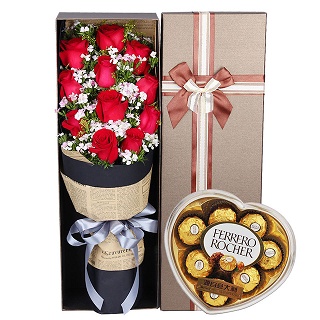 • 【19枝紅玫瑰,綠葉、滿天星 】 + 【德芙鐵盒心形巧克力(98克)】