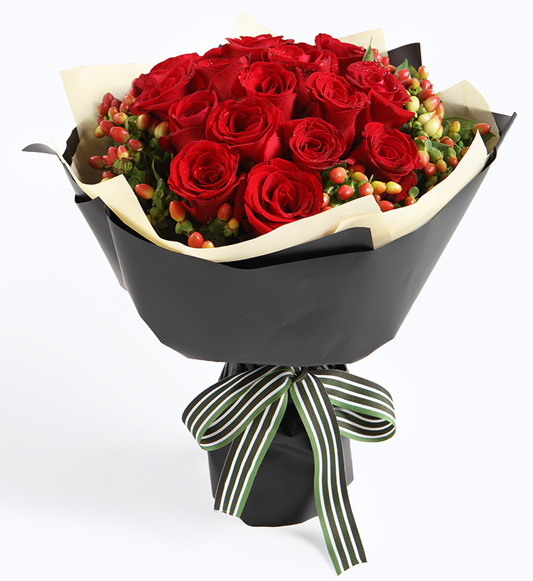 • 【11枝頂級紅玫瑰緊密居中,滿天星豐滿外圍】+【8寸巧克力蛋糕】